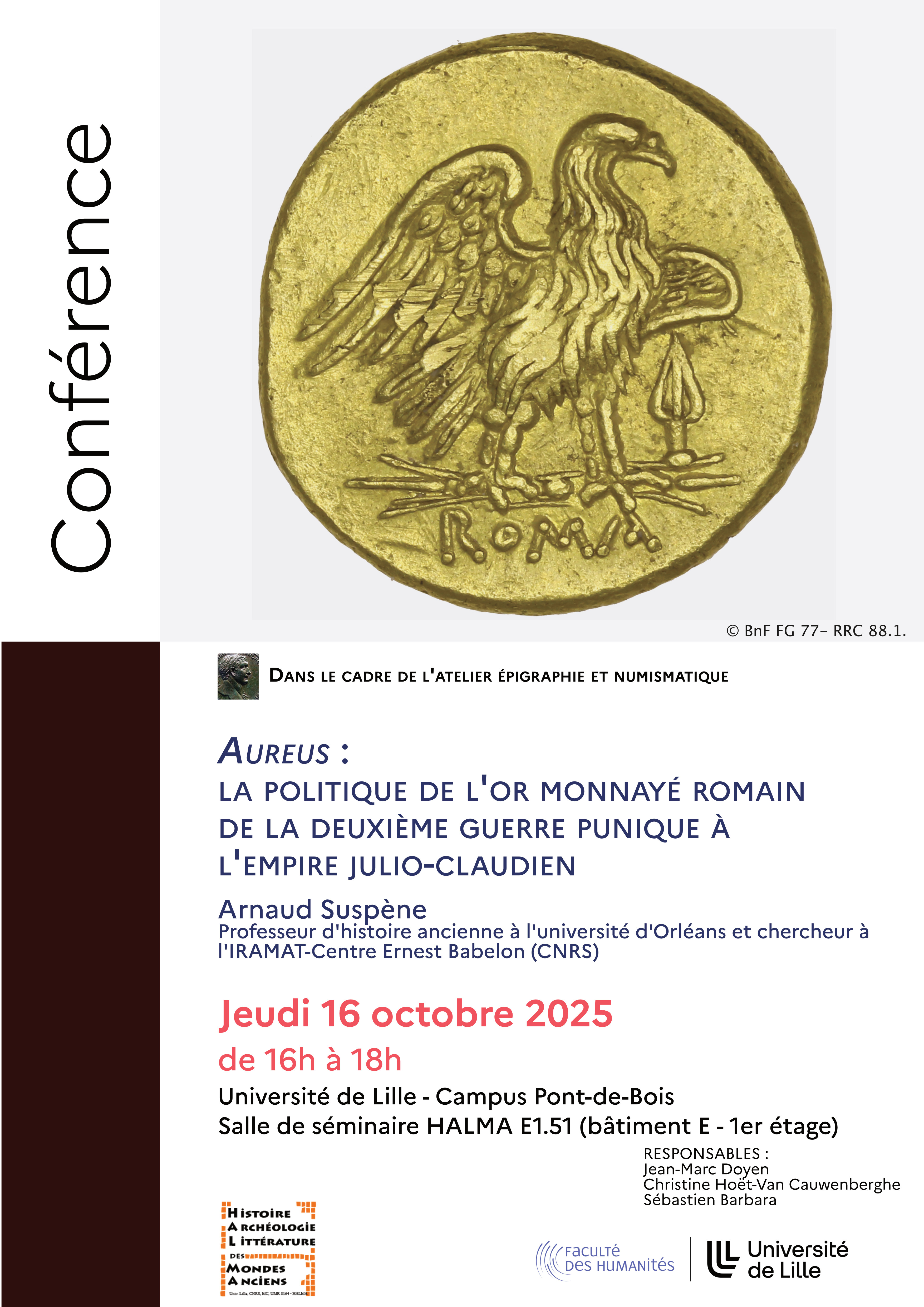 Conférence d'Arnaud Suspène : "Aureus : la politique de l'or monnayé romain de la deuxième guerre punique à l'empire julio-claudien "