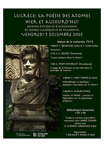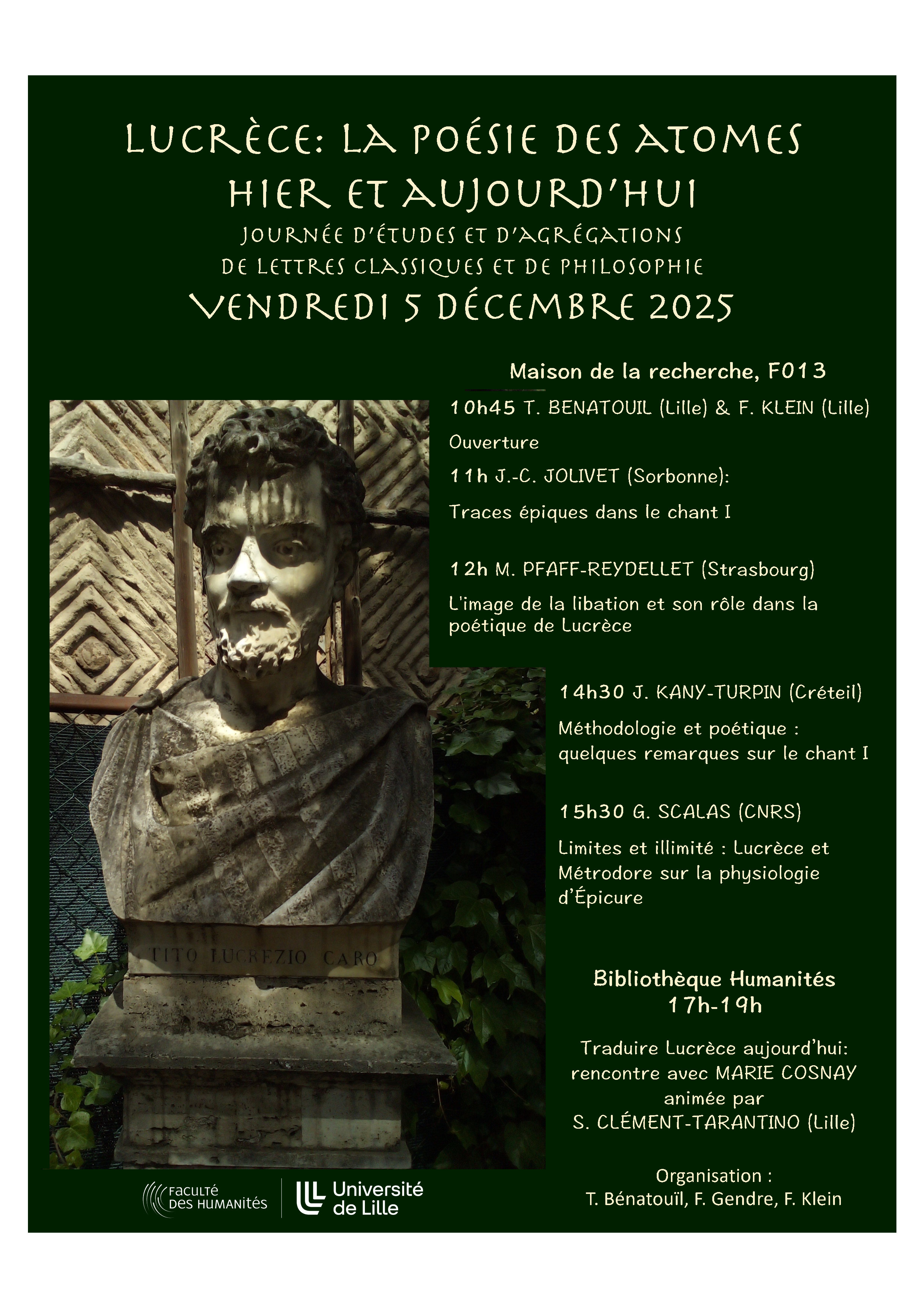 - 17h-19h : Traduire Lucrèce aujourd’hui: rencontre avec MARIE COSNAY, animée par S. Clément-Tarantino (HALMA)